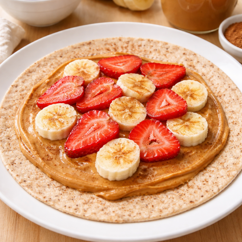 - Απλώνουμε το φυστικοβούτυρο ή αμυγδαλοβούτυρο σε όλη την επιφάνεια της τορτίγιας.